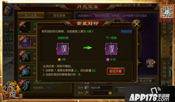 消耗无暇升级宝石,可以对紫装进行升星。紫星最终的封顶上限依然为15星。
