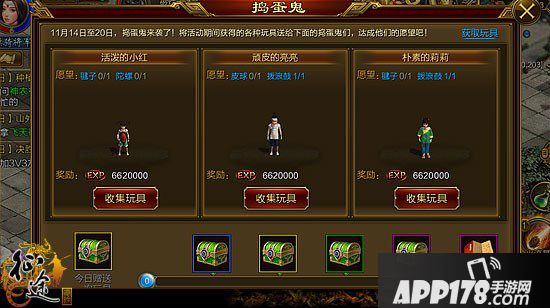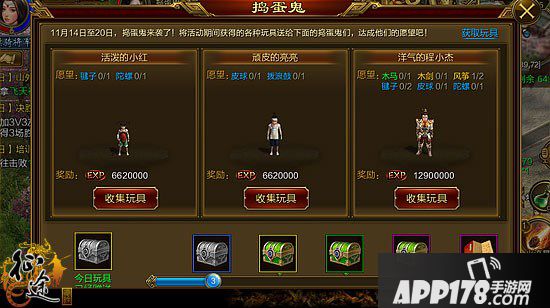 《征途手机版》11月14日捣蛋鬼活动全新上线了!玩家通过每日上线与参加日常搬砖活动获得活动道具“玩具”,收集指定种类和数量的道具就可以兑换礼物,获得丰厚奖励。