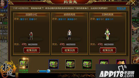 游戏主界面上有捣蛋鬼活动图标,点击后进入到活动界面。玩家可以查看到每个礼物需要的玩具种类和数量以及当前的收集进度。