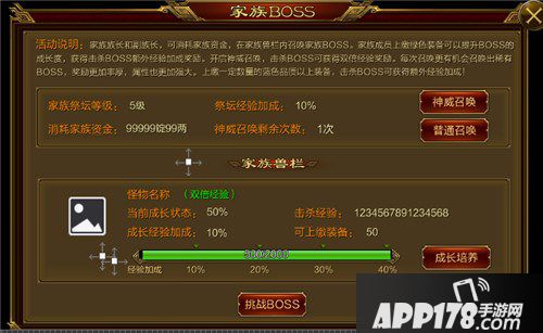 3. 挑战BOSS,消灭在家族地图中出现的BOSS,赢取奖励,根据BOSS的成长度,双倍加成等设定获得额外经验加成。