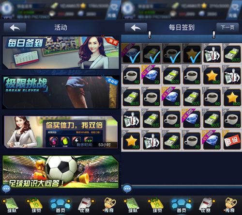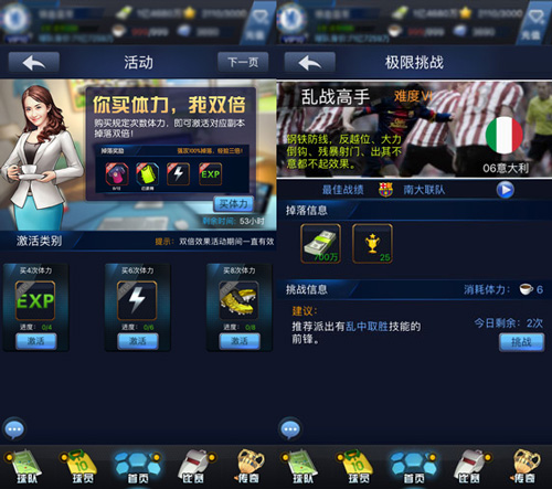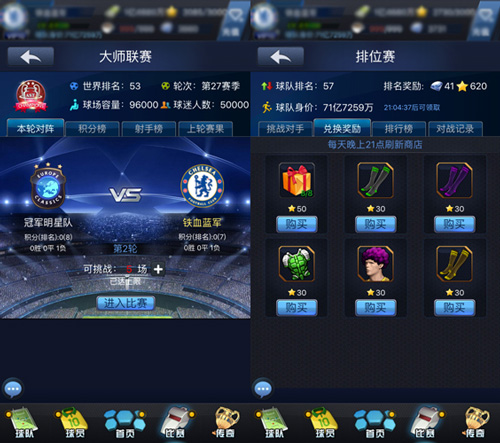 资源积攒起来之后,只有进行合理利用后才能够让玩家成为真正的冠军!譬如玩家积累起来的欧元,可以通过转会市场买到心仪的球员,当玩家大师联赛到达一定等级后,还可以直接购买到神话级别的球员,直接提升球队实力!而钻石的使用则需要配合相应的活动来进行消耗。比如环球探索能够让玩家快速获得神话球员,但需要消耗资源,当然要是遇到“赠机票”活动,一定要毫不犹豫的赶上这趟飞机哦,绝对的物超所值!