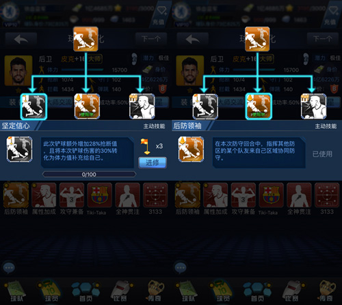 《最佳阵容》中,点击主动技能时,便可弹出主动技能的进阶选项,共有3个分支,需要不同的进修材料进行学习。以“浴火重生”门将为例,进阶1分支为鼓舞防线,门将恢复87%体力的同时,所有后卫也恢复50%体力;进阶2分支为集中精力,体力立刻恢复70%,并可突破体力上限,即俗称的大回血;进阶3分支为分散精力,每次扑救前恢复35%体力,即俗称的小回血。