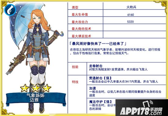 【贯通射击(强)】这个特技是火枪兵迈雅的输出核心点,15s的冷却时间,一般攻击会以中几率最大在3HIT内贯通,并击飞敌人,频繁限制敌方海贼走位并制造强力输出。