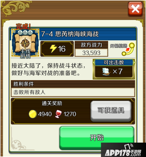 第七章 7-4 此关卡是目前版本经验性价比最高的,可用强力输出加好友1带6,内有黄金船价值8500 + 金币。