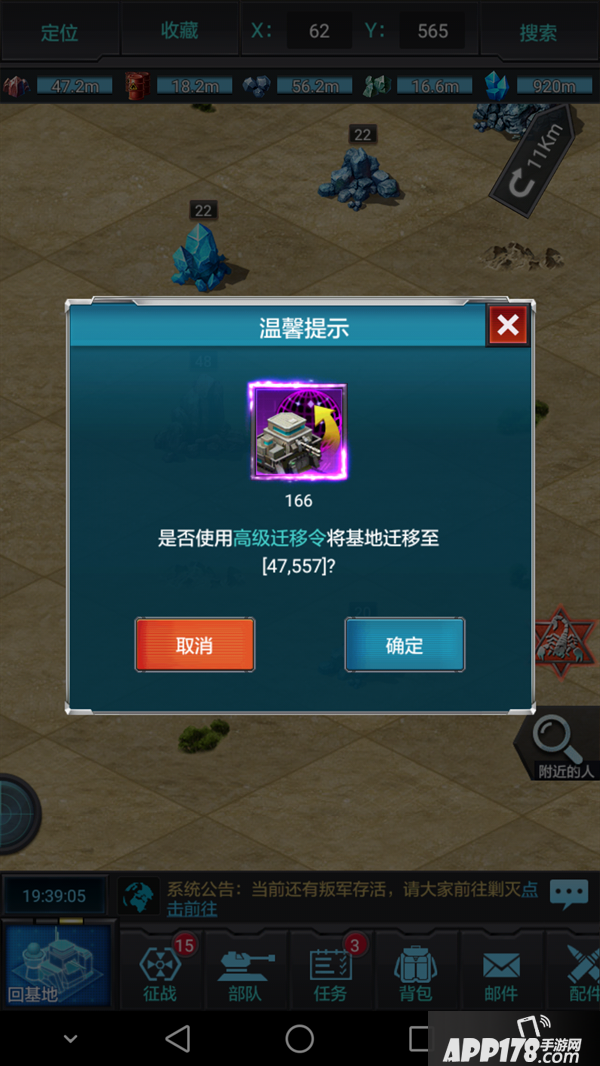 开战期间,如果被敌对的指挥官侦察到基地位置,可以使用保护盾度过。如果不想使用保护盾的情况下,可以选择基地迁移,基地迁移分为随机迁移和高级迁移,这都需要各位指挥官在对应战局下斟酌考虑。