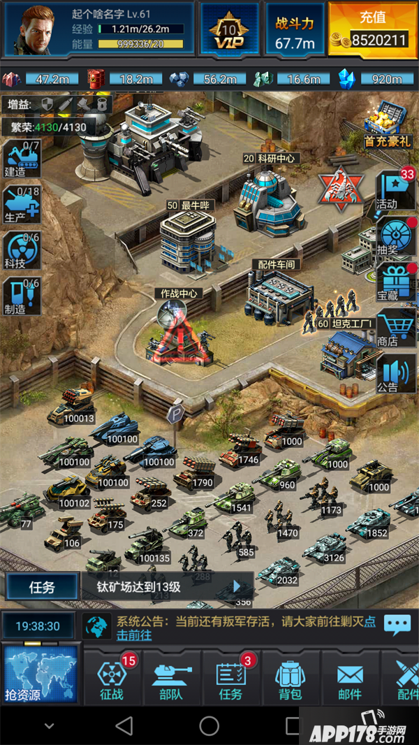 基地建设是立身之地,里面存在许多建筑,每种建筑的外形及功能各不相同。战争工厂是兵种基地,高等级的战争工厂才能生产出高级战力的部队。无论是你想提升建筑速度、行军速度、资源产量还是战斗经验,必须通过科技中心对这些科技进行升级,才能提供各种加成!而司令部才是基地中最重要最基础的建筑,它的存在,它的等级都决定了战争工厂、科研中心的等级,从而影响你的部队战力高低。