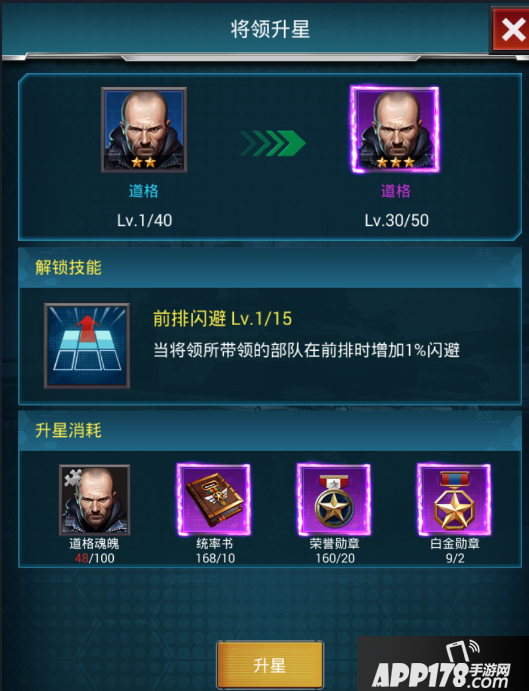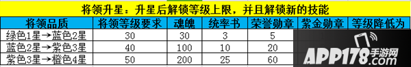 3、将领升星,需要消耗多种材料,包括 同名将领魂魄、统率书、技能勋章、荣誉勋章、紫金勋章,而当前等级会因为升星按比例下降,但将领等级上限提升