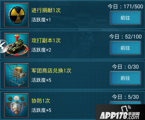 活跃度提升途径:进行捐献、攻打副本、军团商店兑换、协防。