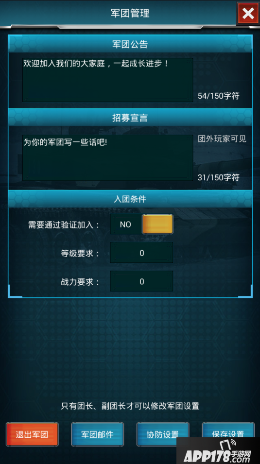 包含军团公告、招募宣言、入团条件的设置修改,只有团长、副团长才可以修改军团设置,另外 退出军团、军团邮件、协防设置 功能也可以在这里进行操作。