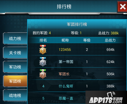 可以查看到 军团排行榜等。