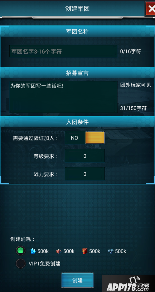 创建军团有两种方式:金币创建or资源创建。