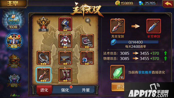 虽然不需要为每个英雄单独配置装备,但主宰装备是有很大的强化空间的,玩家可以用天命石将装备从最低阶的白色逐渐进化到最高阶的金色,也能通过金币和材料消耗来提升装备强化等级和星级。当全身的8件装备达到同一品阶时,会激活共鸣属性按照百分比再次额外提升主宰属性。