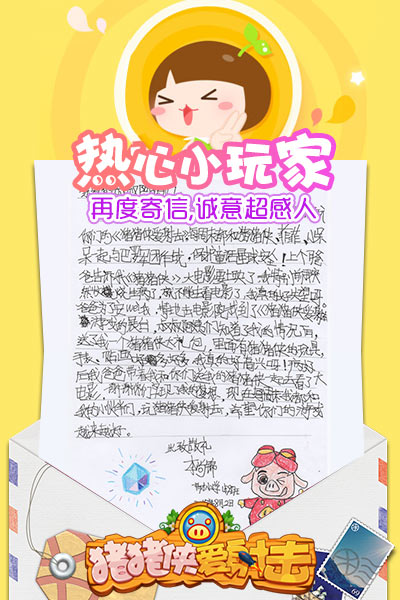 《猪猪侠爱射击》自上线以来就收到很多小玩家来信来电支持,其中来自北京的李尚锦小朋友用诚意感动了猪猪侠团队。之前她因为生病没能去到《猪猪侠爱射击》团队在北京、上海同期举行的猪猪侠大电影超前点映,我们的工作人员特地给她送上了猪猪侠周边大礼包以表慰问。近日她在来信中写道:我非常喜欢猪猪侠的水枪、手表和玩偶,也非常喜欢《猪猪侠爱射击》这款游戏,现在每周末都要和好朋友一起率领猪猪侠、菲菲、小呆呆与巴罗军团作战,保卫童话星球的安全。